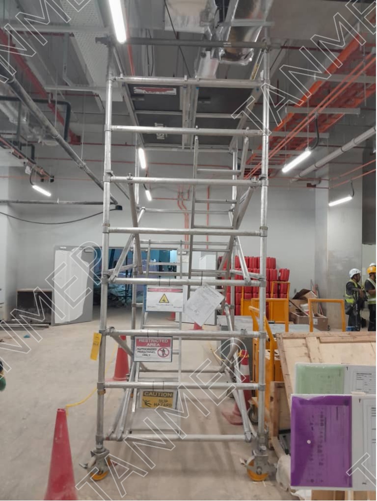 An aluminum mobile tower is a lightweight, portable scaffolding system equipped with wheels for easy movement across job sites. It provides a stable, elevated work platform and is ideal for tasks requiring frequent repositioning, such as maintenance or interior work.